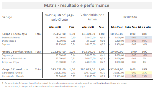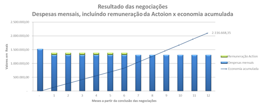 Consideramos este comportamento para a contratação integral do Plano de Redução de Custos Action, todavia, também é possível a contratação de apenas determinadas atividades, nestas condições a remuneração será discutida caso a caso, pois no programa completo as atividades se complementam e trazem o resultado esperado, em contratações pontuais, o objetivo do cliente pode ser apenas um trabalho de consultoria, não resultando necessariamente em redução de custos.