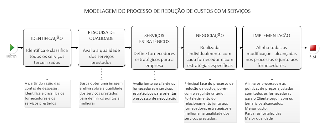 A redução de custos através de fornecedores de serviços e produtos envolve o aprofundamento sobre as necessidades estratégicas da empresa, antes de qualquer negociação conhecemos os fornecedores estratégicos e quais o serviços e produtos são imprescindíveis à empresa. Também analisamos a qualidade dos serviços prestados e dos produtos fornecidos, através do acompanhamento destes e de entrevista ou uma breve pesquisa de satisfação com os clientes diretos destes serviços e produtos.