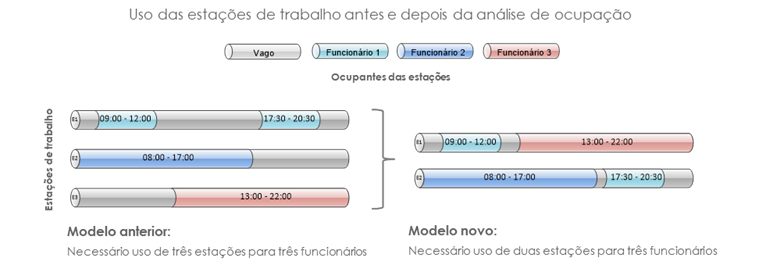 Avaliamos a efetiva ocupação das estações de trabalho, os horários de sua ocupação e as estações que ficam ociosas, sem ocupação, mesmo que por algumas horas.